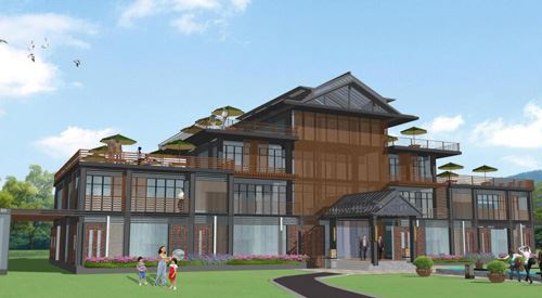 度假酒店周邊環境整體設計風格定位為簡約大氣。度假酒店前保留一定的草坪面積,使酒店一層窗口有比較開闊的視野和較好的采光。